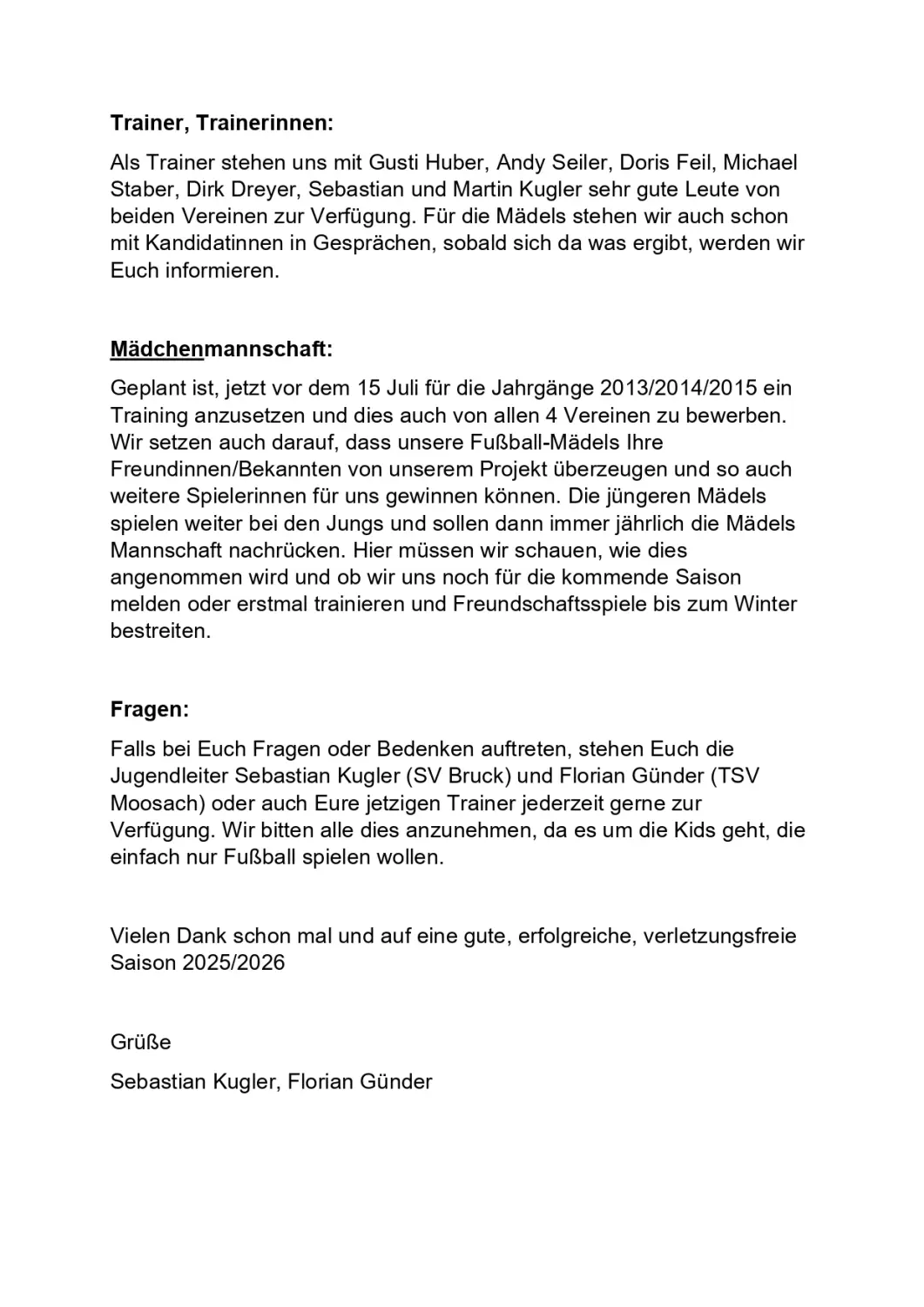 Unser Jugendleiter Florian Günder 0172-1398648, steht Ihnen bei Fragen oder für Auskünfte jederzeit gerne zur Verfügung.